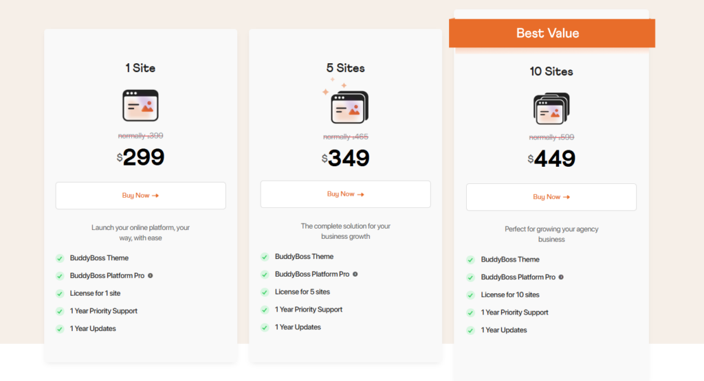| 10 Sites | $449 | $599 | 10 | Theme, Platform Pro, 1 Yr Updates & Priority Support |