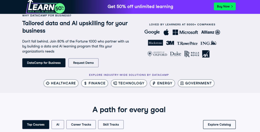 DataCamp offers tailored solutions for teams and enterprises, providing group management features, progress tracking, and the ability to create custom learning paths for entire organizations.