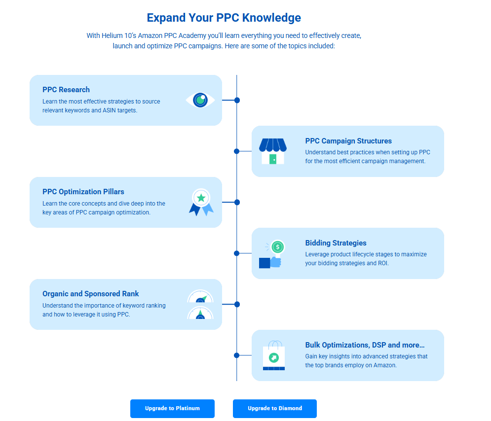 Helium 10 Academy is a great tool for learning how to sell on Amazon. It’s a free training program from Helium 10 that works for beginners and experienced sellers alike.