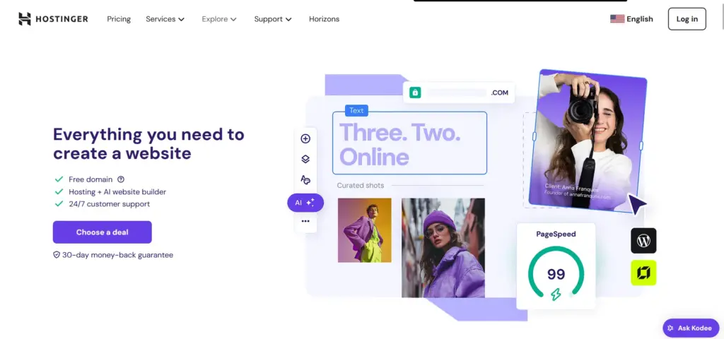 Hostinger’s AI builder creates a custom site in minutes. Please answer a few questions about your site type, like blog or store, and it generates a design with text and images. I built a blog layout in 5 minutes, tweaking fonts and colors via drag-and-drop. The builder includes SEO tools to optimize your site for search engines.