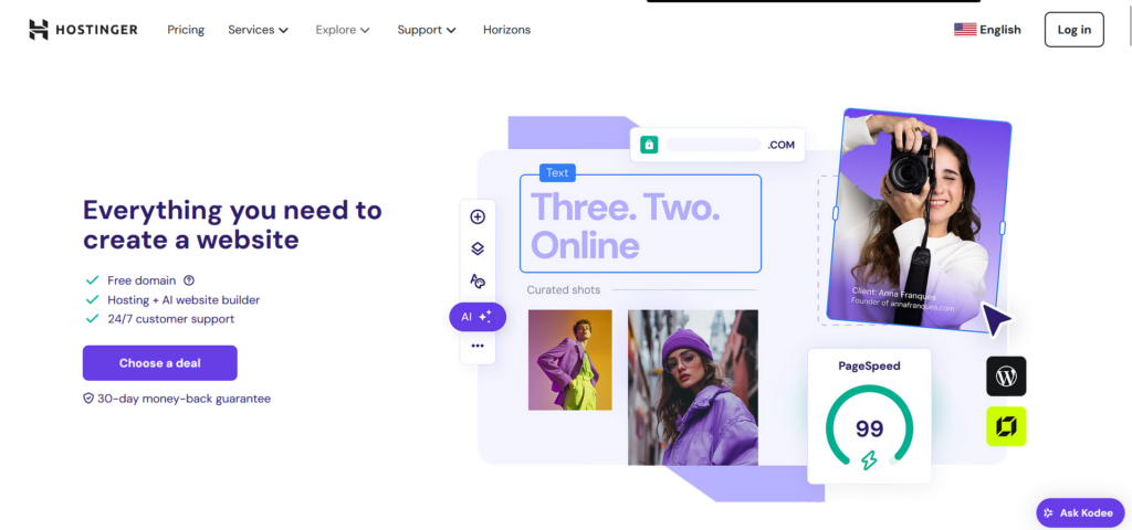 Hostinger provides shared hosting, WordPress-optimized plans, VPS, and cloud hosting, along with tools like an AI website builder and free SSL certificates. It’s trusted by bloggers, small businesses, and developers for its value and ease of use.