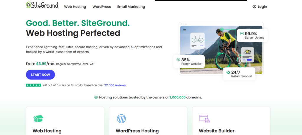 Overview: SiteGround offers premium shared, cloud, and WP hosting with top-notch support and speed. It’s ideal for pros but costs more.