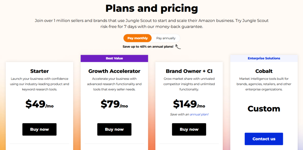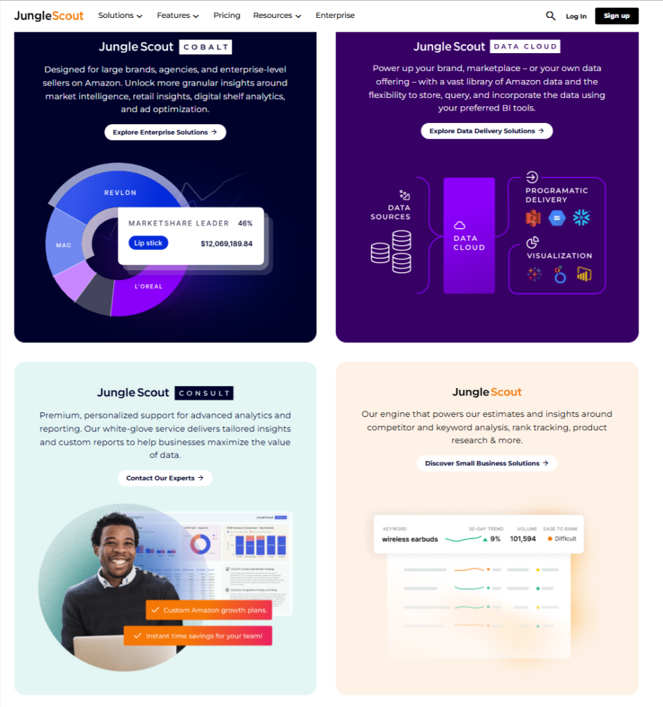 | Core Features | Chrome/Firefox extensions, Single user, Jungle Scout Academy, Review automation, AI-assisted analytics | All Starter features, Advanced research tools | All Growth features, Competitive Intelligence tool | Enterprise-level tools, Customizable dashboards |