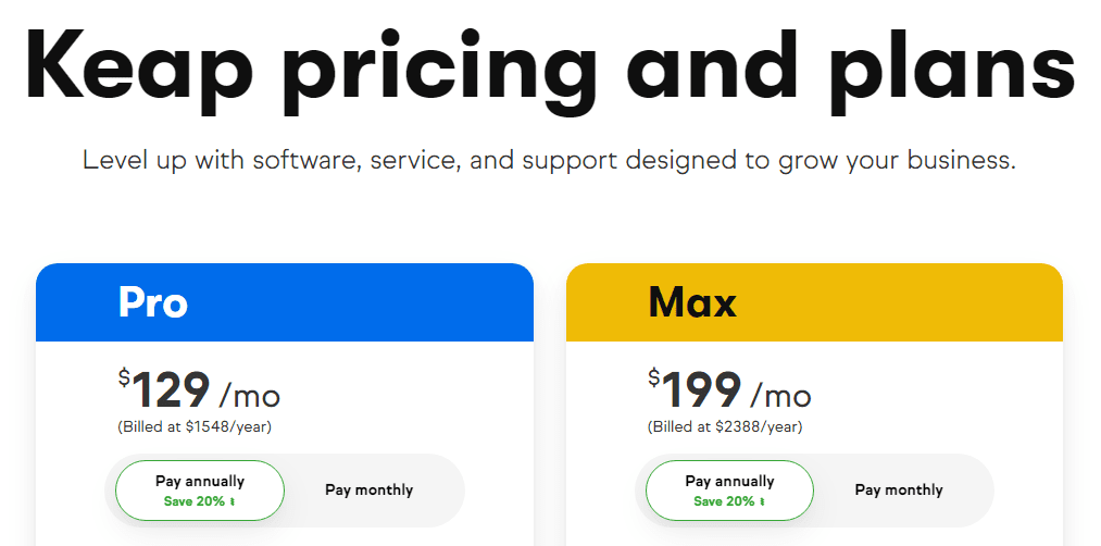 Keap now works on a scaling model instead of separate “Pro/Max” plans. The base price is $249/month (annual billing) for 2 users + 1,500 contacts, but the cost increases as you add more contacts or additional users.