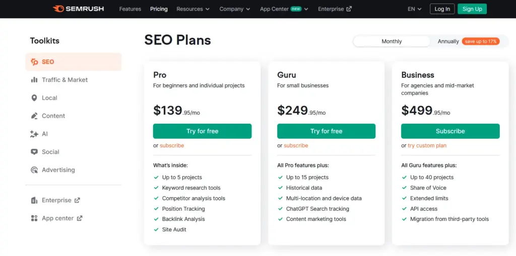 Semrush offers three main plans—Pro, Guru, and Business—plus custom Enterprise options. Here’s the 2025 pricing breakdown based on official data: