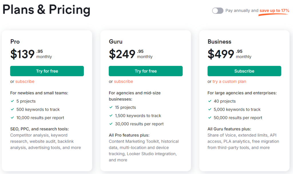 Guru$249.95$208.33 (~17% savings)15 projects, 1,500 keywords, 30,000 results/report, content tools, historical dataGrowing agencies, SMBs