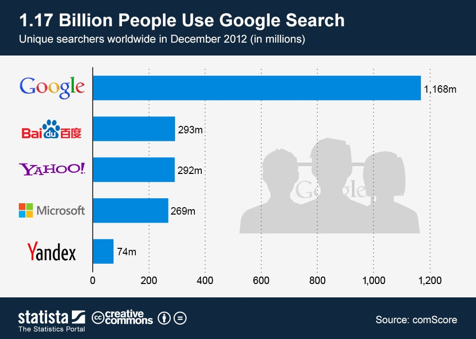 Google holds 81.95 percent market share, with Bing at 10.51 percent, Yahoo 2.67 percent, Yandex 2.42 percent, DuckDuckGo 0.60 percent, and Baidu 0.53 percent—yet Baidu attracts 781 million monthly visits.